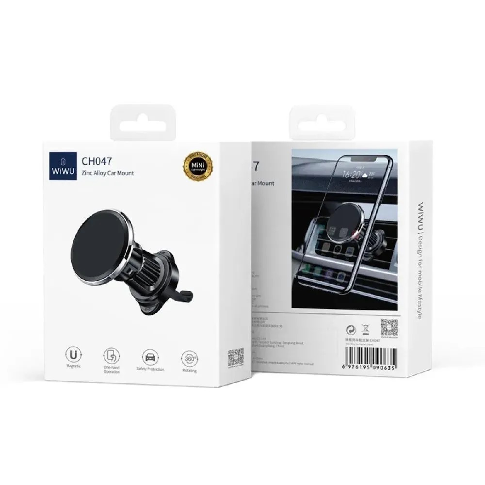 Автотримач WiWU CH047 забезпечує надійне кріплення завдяки гачку-кліпсі, який міцно фіксується на дефлекторі автомобіля, не пошкоджуючи вентиляційні решітки. Обертовий механізм на 360 градусів дозволяє легко змінювати орієнтацію смартфона з вертикальної на горизонтальну, що особливо зручно для навігації та відеодзвінків. Поєднання матеріалів цинкового сплаву (Zinc alloy), полікарбонату (PC) та термопластичного поліуретану (TPU) гарантує міцність, стійкість до зношування та приємне тактильне відчуття. Магнітна пластина забезпечує надійну фіксацію гаджета навіть на нерівній дорозі.