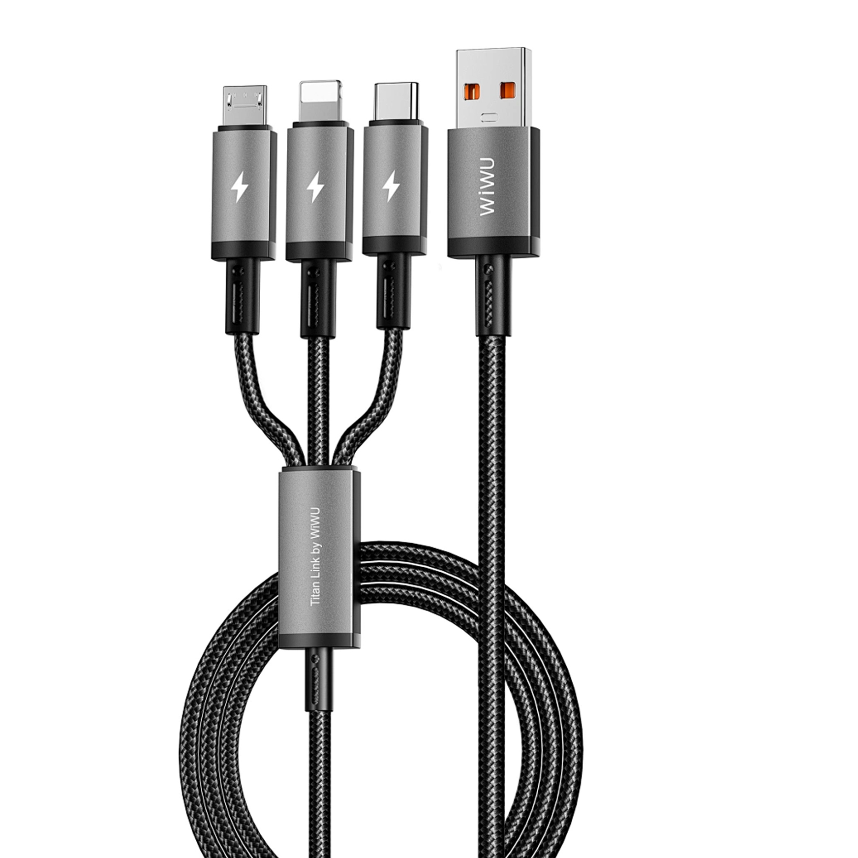 Кабель WiWU Wi-C059 поєднує сучасний стиль і високу практичність завдяки продуманому дизайну. Виготовлений із міцного алюмінієвого сплаву та нейлонового обплетення, він стійкий до зносу, розривів і сплутування, що забезпечує довговічність навіть при інтенсивному використанні. Довжина 1.2 метра робить його зручним для використання вдома, в офісі чи в подорожах. Колір Space Grey надає кабелю елегантного вигляду, а компактна конструкція з трьома роз’ємами (Lightning, USB-C, Micro-USB) дозволяє заряджати різні пристрої одним кабелем. Надійні роз’єми гарантують стабільне з’єднання та комфорт у використанні.