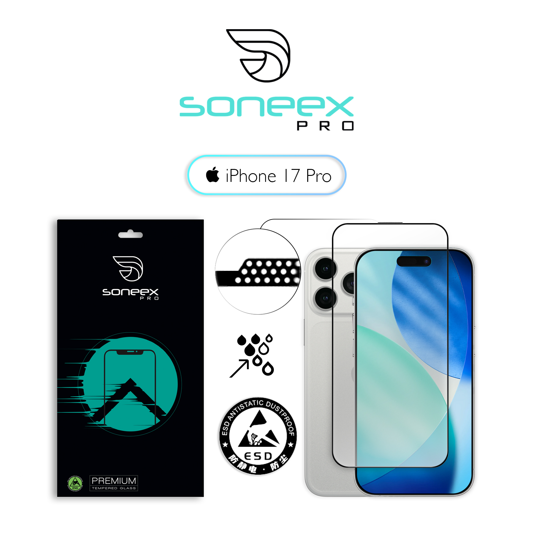Захисне скло Soneex виготовлене з використанням елементів алюмінію у сплаві, товщиною 0.26 мм, що забезпечує ефективний захист дисплея від подряпин і пошкоджень. Олеофобне покриття сприяє легкому очищенню поверхні від відбитків пальців. Скло має зносостійкість до 3000 циклів використання, що гарантує його довговічність. Задня пластина товщиною 0,65 мм оснащена антистатичною функцією, яка запобігає притягуванню пилу електростатикою. У комплект входять волога серветка, мікрофібра та стікери для видалення пилу, що спрощують самостійне наклеювання скла.
