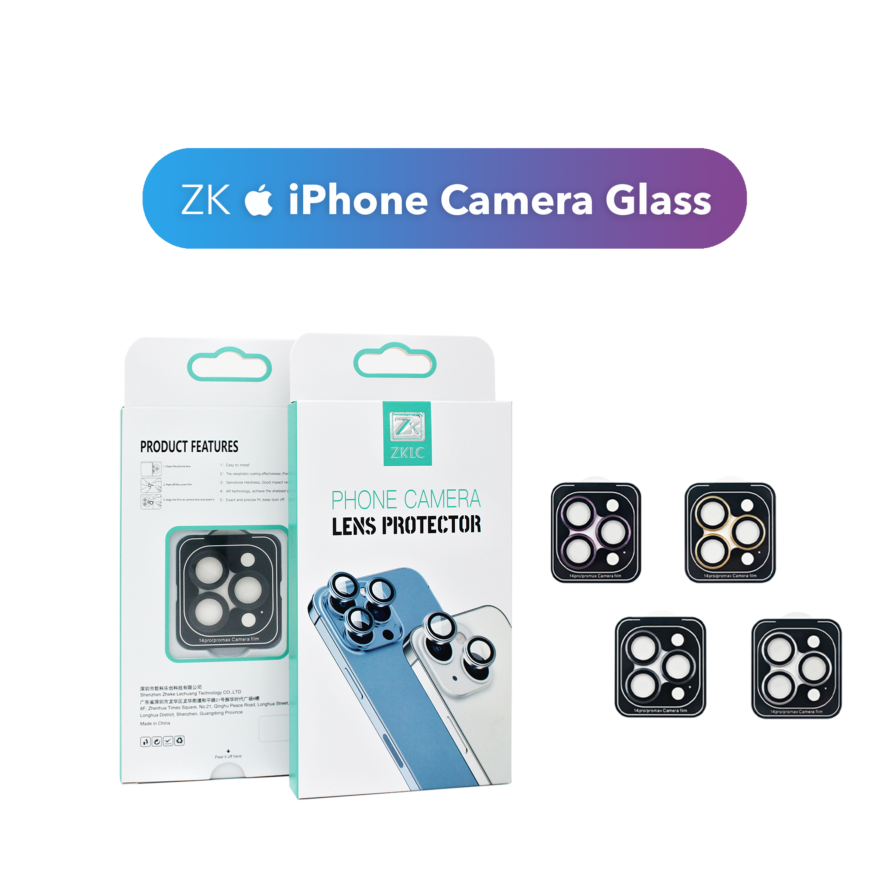 У дизайні скло ZK вирізняється елегантною чорною рамкою, яка гармонійно доповнює зовнішній вигляд iPhone. Точна підгонка забезпечує щільне прилягання до камери, не заважаючи роботі об'єктива чи використанню захисного чохла. Доступність у різних кольорах, таких як Black, Blue, Diamond-Black, Diamond-Blue, Diamond-Purple, Diamond-Red, Purple, Diamond-Rainbow, Red, Diamond-Silver, Rainbow та Silver, дозволяє користувачам обрати варіант, що найкраще відповідає їхньому стилю та кольору пристрою. Цей аксесуар поєднує в собі функціональність та стиль, забезпечуючи захист камери без компромісів у дизайні.